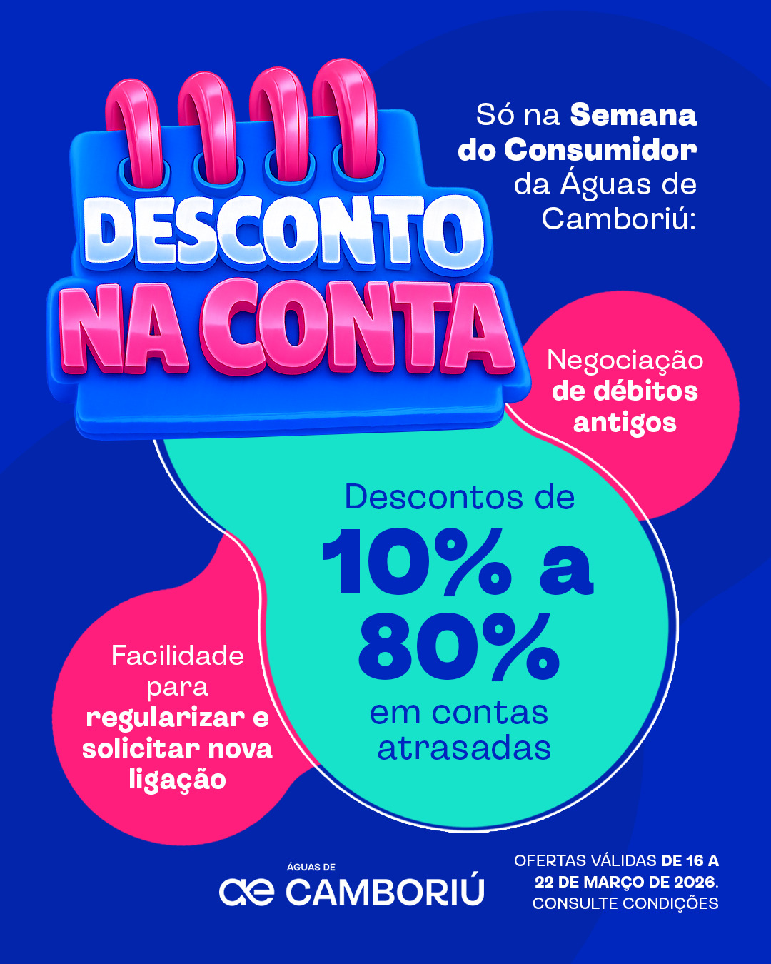 Em celebração ao Dia do Consumidor, a Águas de Camboriú realiza uma campanha especial de negociação de débitos durante o mês de março, oferecendo condições facilitadas para que os clientes possam regularizar pendências financeiras. O objetivo da iniciativa é ampliar as oportunidades de atendimento e negociação, gerando ainda mais conforto aos clientes.